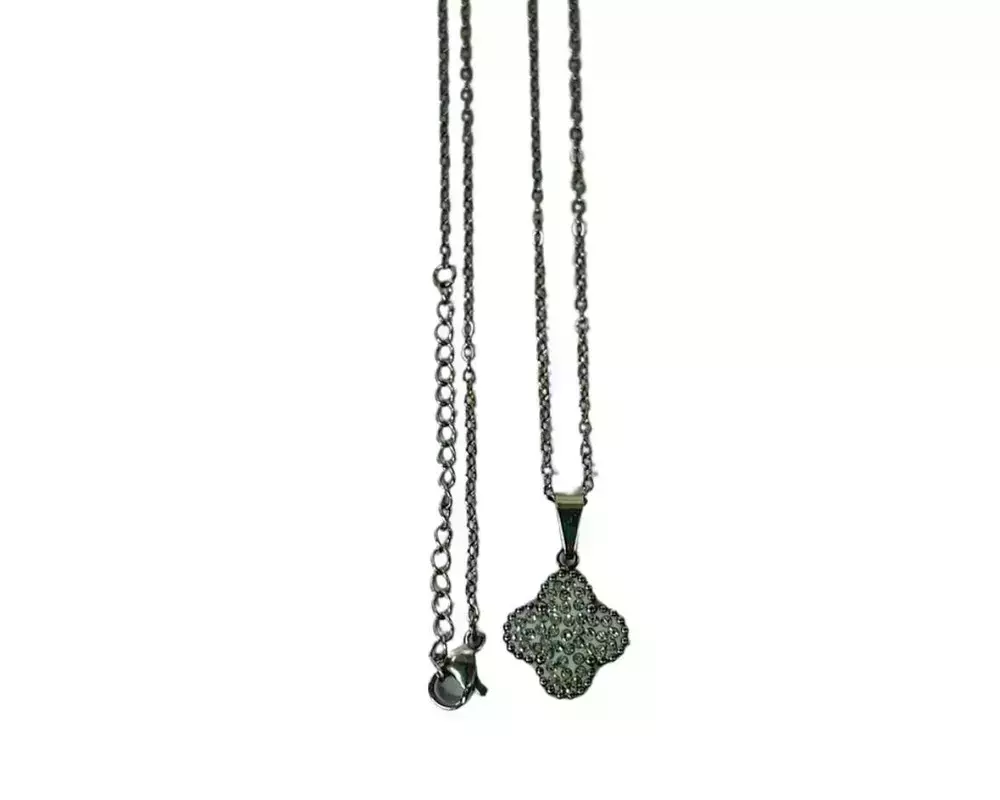 Este colar de aço inox prateado é adornado com um pingente de trevo cravejado, oferecendo um toque de sorte e elegância.